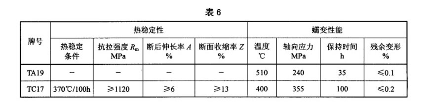 3.4.3 訂購方要求并在合同中注明時,鈦合金棒材的高溫拉伸、持久性能應符合表5的規定,TA19和TC17鈦合金棒材的熱穩定性和高溫蠕變性能應符合表6的規定。